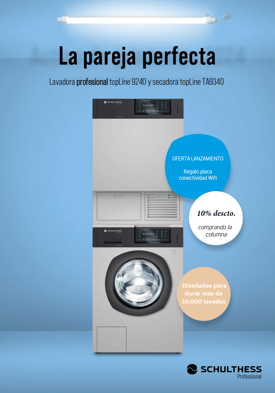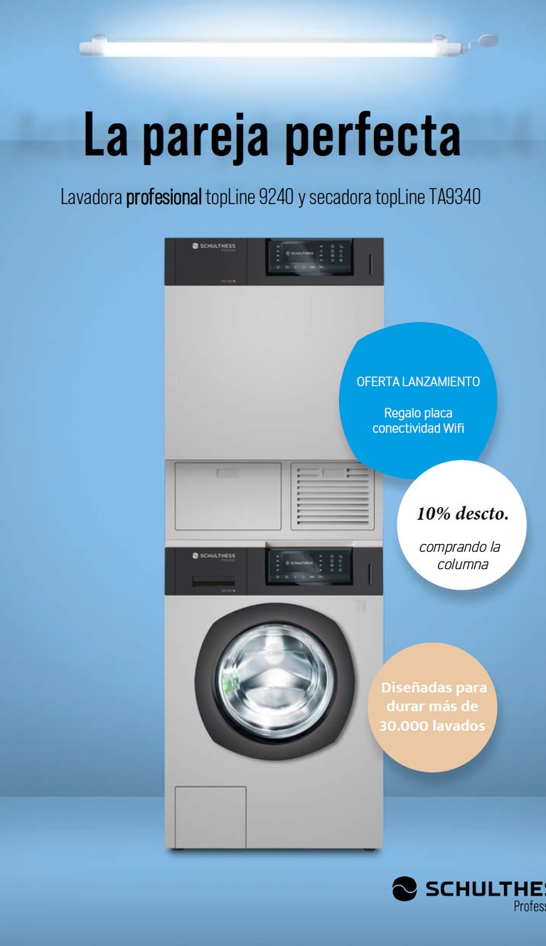 En poco más de 0,5 m2 instalamos una lavadora y secadora profesional compactas de 8 kgs. Diseñadas para durar más de 30.000 horas.